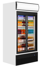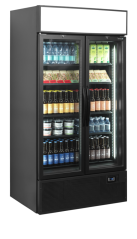 Chladicí skříň dvoudveřová prosklená s posuvnými dveřmi:samozavírací posuvné prosklené dveře, světelný reklamní panel, vnitřní svislé…