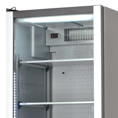 Jednodveřová chladicí skříň s prosklenými dveřmi:ventilované chlazení, automatické odtávání, digitální termostat, 3 výškově nastavitelné…